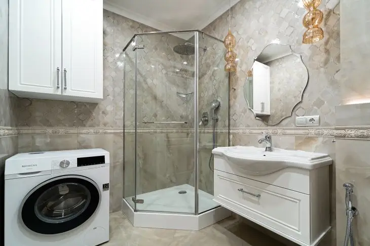 Второе — песочный или тёплый беж. Эти оттенки делают ванную уютной, особенно в сочетании с текстурой камня.